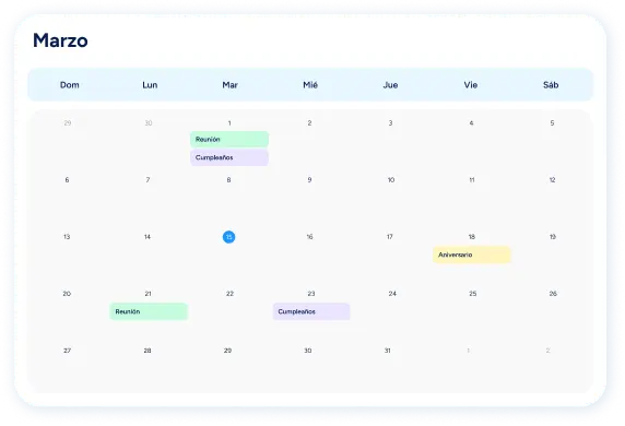Desde reuniones y capacitaciones hasta cumpleaños y aniversarios, todo se gestiona y visualiza en tu calendario de Naaloo.