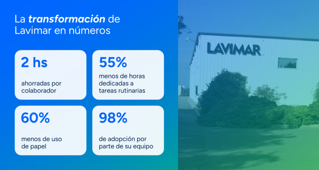 Detrás de estos resultados hay una decisión clara de gestión: liberar tiempo operativo para ganar tiempo estratégico. Gracias al trabajo coordinado entre los líderes, el área de RRHH y la buena respuesta de los colaboradores, Lavimar hoy ahorra en promedio 2 horas por colaborador, logró reducir en un 55% las horas dedicadas a tareas rutinarias y disminuir en un 60% el uso de papel, mientras consolida una forma de trabajar más ágil y ordenada.