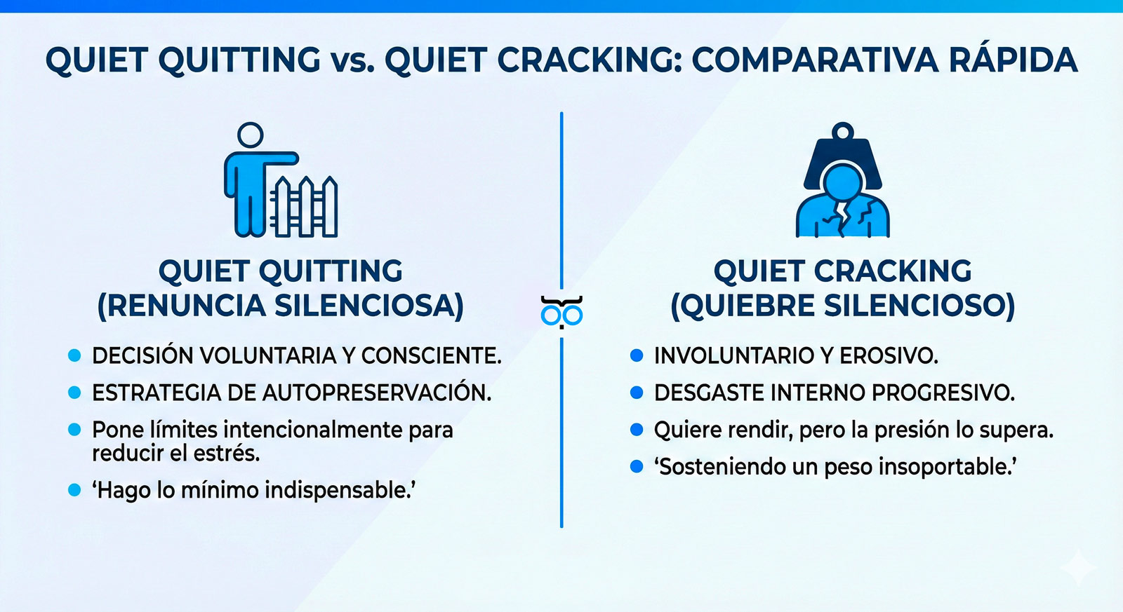 En quiet quitting hay una decisión de bajar esfuerzo. En Quiet Cracking la persona quiere rendir, pero se va quebrando por presión, falta de reconocimiento o futuro incierto.